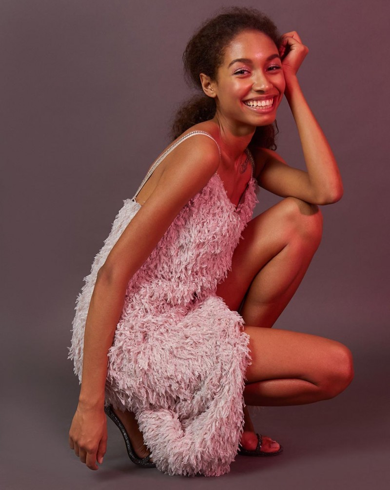 Платье длины миди на бретелях. Тонкие бретели со стразами, разрез спереди. Выполнено из фактурной ткани нежно-розового цвета, имитирующей перья страуса. Требует бережной и внимательной эксплуатации. На подкладке. Образ дополнят атласные лодочки или мюли. Сделано в России