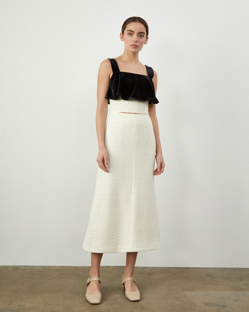 Платье на бретелях. Приталенное платье миди с застежкой на молнию на спине и юбкой годе. Платье выполнено из необычной ткани букле на основе хлопка и льна, на подкладке. Широкие бретели и отлетная кокетка из бархатной ткани контрастного цвета создают особый геометрический рисунок с разрезом на талии. Элегантный образ завершат минималистичные аксессуары и изящная обувь. Сделано в России.