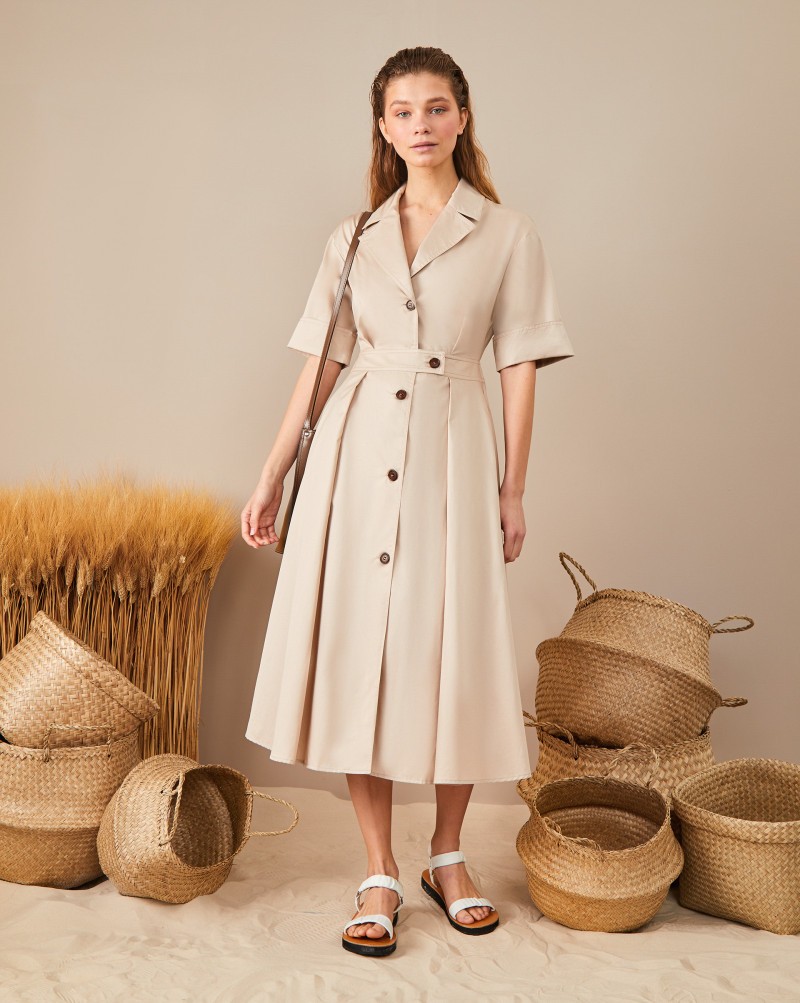 Платье на пуговицах. Приталенное платье со строгим отложным воротником, слегка спущенной линией плеча и коротким рукавом с отворотом. Крупные складки на расклешенной юбке и пояс с застежкой на пуговицу подчеркивают талию. Образ завершат крупные аксессуары, обувь на небольшом каблуке. Сделано в России.