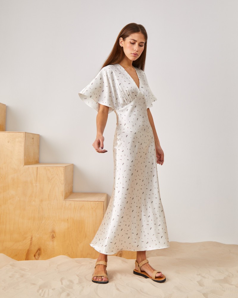 Шелковое платье. Платье миди в бельевом стиле с рукавом-«крылышком». Глубокий V-образный вырез и завышенная линия талии. Платье скроено «по косой», благодаря чему ткань ниспадает и струится при движениях. Выполнено из итальянского шелка с ненавязчивым и нежным ягодным принтом. Ткань была выпущена в лимитированном количестве специально по заказу 12 STOREEZ. При выборе размера нужно учитывать, что посадка должна быть свободной, тонкий шелк требует бережного обращения. Образ можно завершить минималистичной обувью, для вечернего образа стоит отдать предпочтение изящным босоножкам на каблуке. Сделано в России.