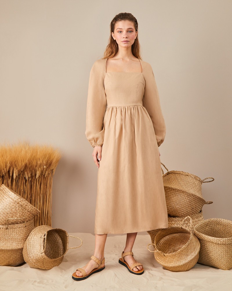 Приталенное платье с глубоким квадратным вырезом. Пышные рукава с резинкой по нижнему краю и пышная юбка длины миди визуально корректируют пропорции фигуры, подчеркивая женственный силуэт. Платье выполнено из 100% льна, на подкладке. Сделано в России