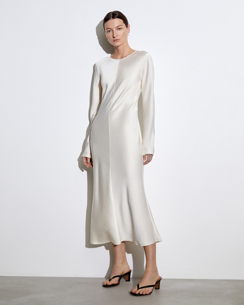 Платье из искусственного шелка. Особенность этого платья — изящные молнии на длинных рукавах и слегка расклешенная книзу юбка, которые вместе придают образу легкость и подчеркивают текстуру переливающейся ткани. - Полуприлегающий силуэт, застежка на молнию в центральном шве спинки - Французская ткань с креповым переплетением — мягкая и приятная на ощупь, упругая и эластичная. Благодаря высокой плотности практична в уходе и долговечна - Без подкладки Сделано в России.