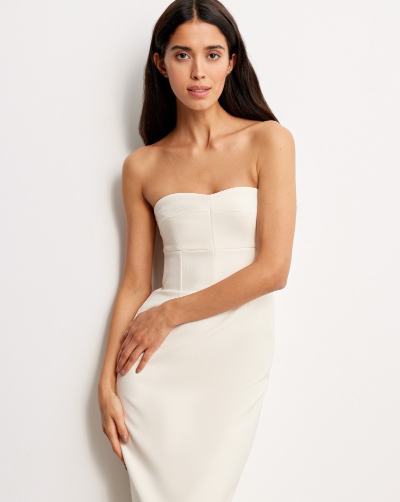 Платье-бюстье. Приталенное платье с открытой спиной и узкой прямой юбкой. Застежка на молнию и крючки, в боковых швах сделаны косточки, а по линии декольте проложена силиконовая тесьма для фиксации лифа. Платье выполнено из плотной костюмной ткани с вискозой — мягкой и шелковистой на ощупь. Ткань почти не мнется благодаря небольшому количеству искусственных волокон. Сделано в России. «Это классическое коктейльное платье, но мы хотели сделать его прежде всего удобным. Поэтому дополнили его съемными бретелями и широкой горизонтальной бретелью, которая фиксирует вырез на спине. Можно добавить е нему жакет из костюмной ткани — просто накиньте его на плечи, если стало прохладно». Марина и Ирина Голомаздины