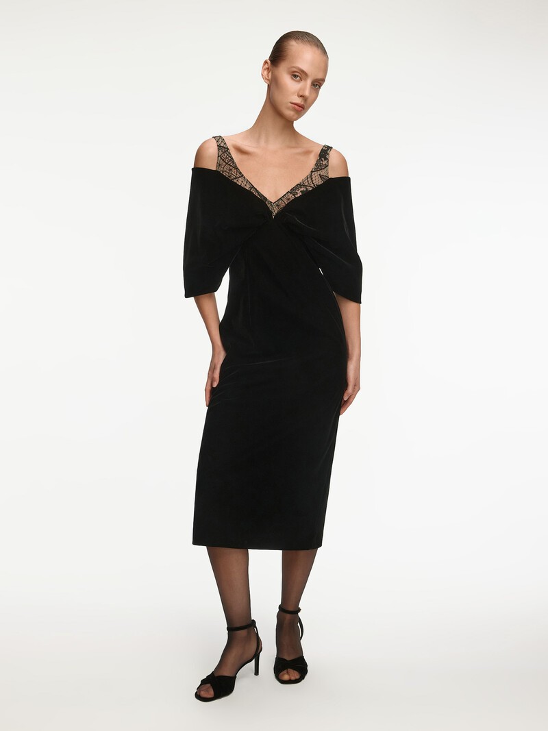 Бархатное платье-футляр с объемной драпировкой, имитирующей бант — она акцентирует внимание на плечах, не сковывая движений. Для модели выбрали плотный мягкий бархат с густым ворсом, который деликатно поблескивает в складках. Фактуру материала подчеркивают бретели из кружева, обрамляющие глубокое декольте.
