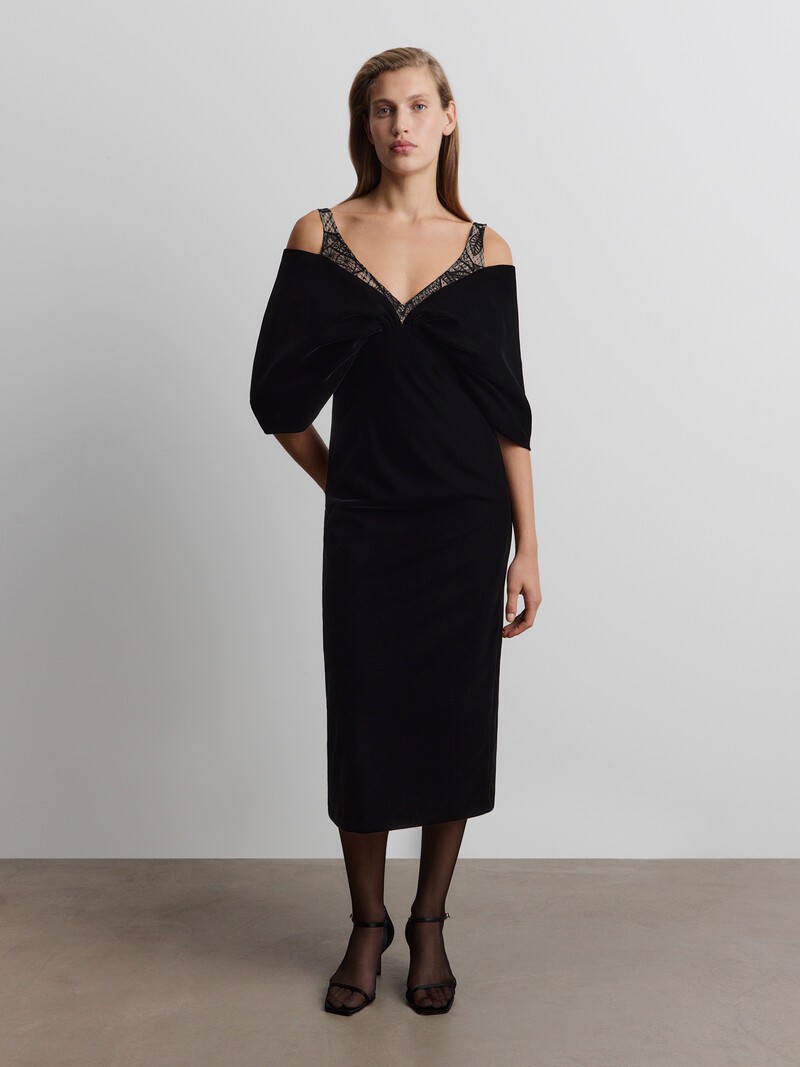 Бархатное платье-футляр с объемной драпировкой, имитирующей бант — она акцентирует внимание на плечах, не сковывая движений. Для модели выбрали плотный мягкий бархат с густым ворсом, который деликатно поблескивает в складках. Фактуру материала подчеркивают бретели из кружева, обрамляющие глубокое декольте. Сделано в России.