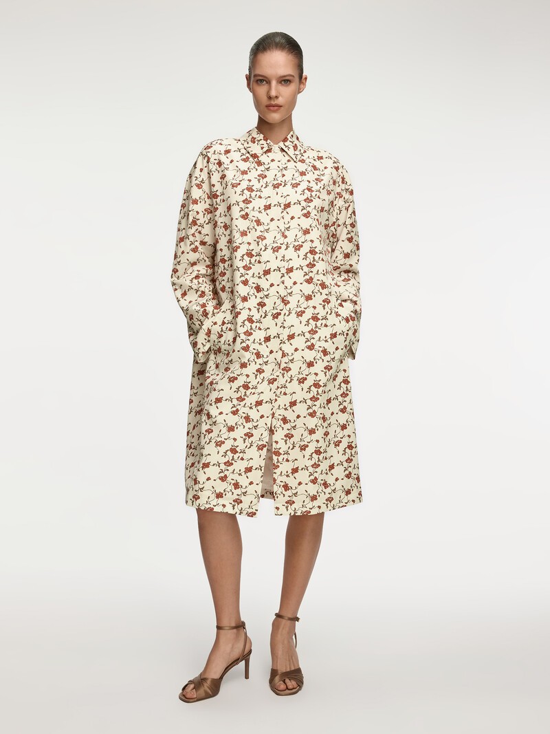 1. Тафта с 12% шелка — плотная, мягкая, слегка хрустящая ткань с матовым блеском 2. Чтобы добиться плавных, акварельных переходов цвета, мы отказались от цифровой печати и работали в технике шелкографии 3. Можно носить как платье или как тренч — поверх шелкового платья в бельевом стиле 4. Чтобы не перегружать образ деталями, мы сделали застежку на скрытые пуговицы 5. Благодаря подкладке из тончайшей вискозы с шелком платье лучше держит форму и приятно скользит Тафта мнется, и в складках ее блеск становится еще выразительнее. Чтобы разгладить ткань, используйте утюг (не отпариватель)