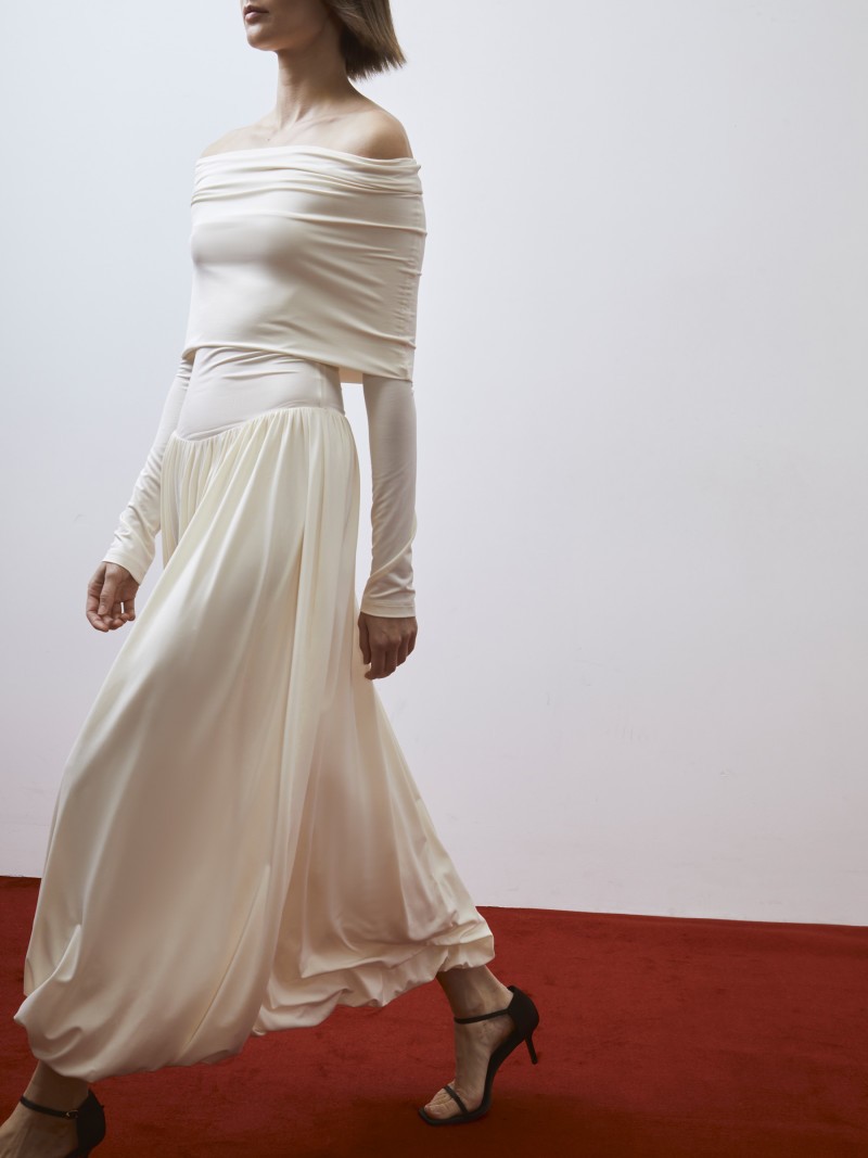 Вечернее платье с открытой линией плеч и подчеркнутой талией, которая выглядит еще тоньше благодаря пышной юбке с множеством складок. Глубина декольте регулируется с помощью широкого отворота — в сочетании с длинными рукавами платье может выглядеть и более скромно, но не менее женственно. Мы сшили его из гладкого трикотажа на основе вискозы — мягкого, дышащего и практически невесомого. Рекомендуем носить с бесшовным бельем. Сделано в России.