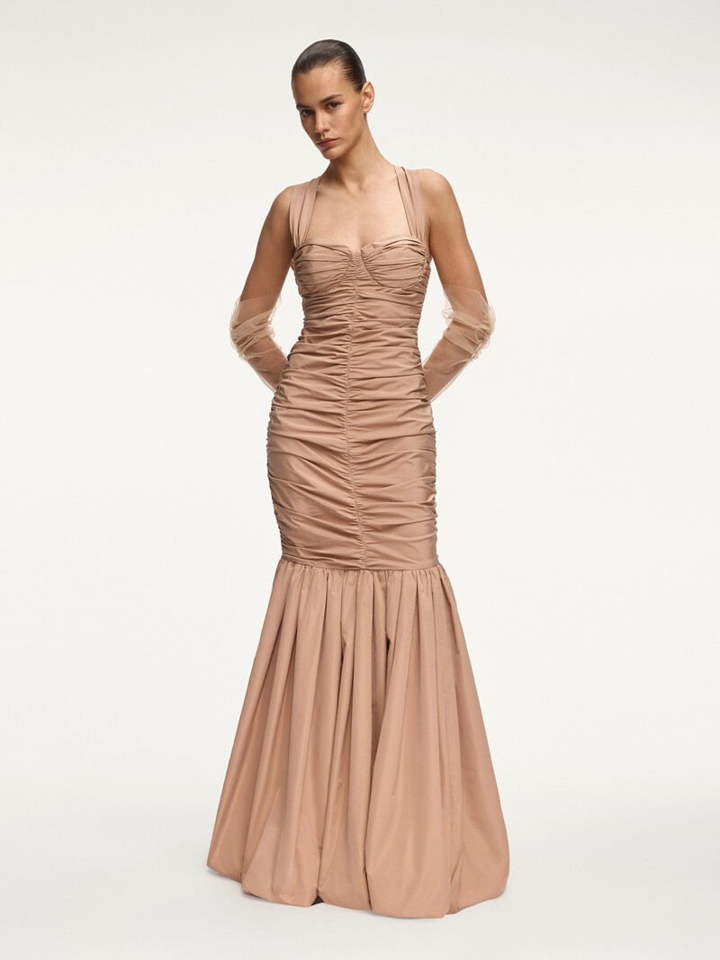 1. Тафта с 12% шелка — плотная, мягкая, слегка хрустящая ткань с матовым блеском 2. Благодаря сборке и коктейльному лифу с косточками платье комплиментарно подчеркивает фигуру и формирует стройный силуэт 3. Подкладка из эластичной итальянской вискозы почти не ощущается, делает платье плотнее и долговечнее Тафта мнется, и в складках ее блеск становится еще выразительнее. Чтобы разгладить ткань, используйте утюг (не отпариватель) Вернуть или обменять изделие можно, только если все ярлыки на месте