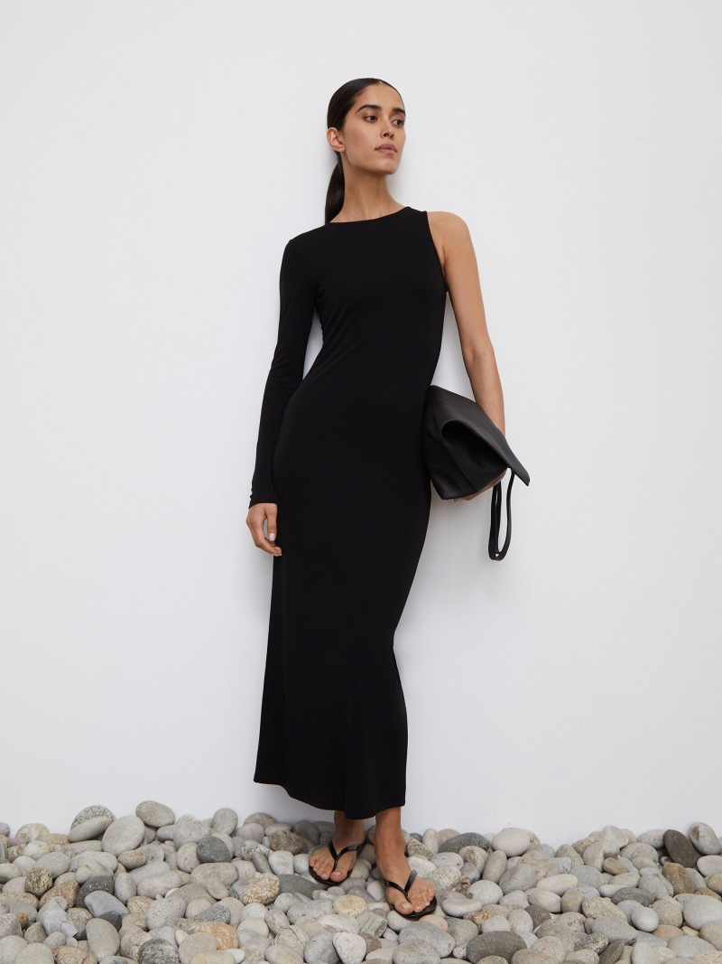 Платье макси с длинным узким рукавом — сдержанный образ, который обращает на себя внимание благодаря необычному крою. Летний трикотаж на основе вискозы отвечает за комфорт, а искусственные волокна делают материал более долговечным. Вискозный трикотаж может вытягиваться на плечиках или садиться после стирки: храните платье на полке и пользуйтесь услугами химчистки. Сделано в Китае.