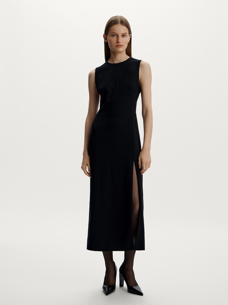 Универсальное платье-футляр из легкой матовой ткани, созданной на одной из лучших фабрик Португалии, можно стилизовать как для офиса, так и для вечера. Оно садится точно по фигуре, мягко облегая силуэт, а высокий боковой разрез эффектно распахивается в движении. Застегивается на молнию. На подкладке из крепового шифона. Сделано в Турции.