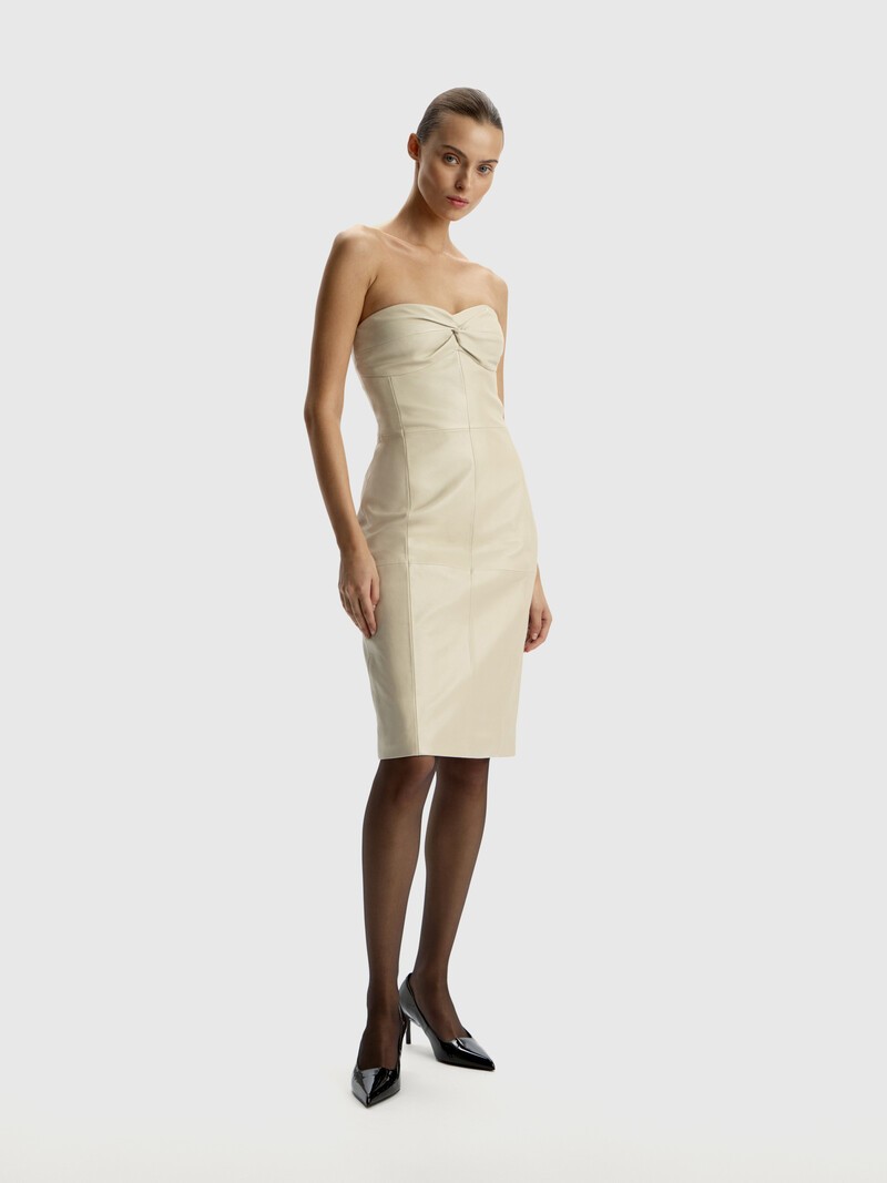 Платье-бюстье прилегающего силуэта с декоративным узлом на груди — для подчеркнуто женственных образов. Для лучшего прилегания по верхнему краю проложена силиконовая тесьма. Материал — тонкая, мягкая и пластичная кожа ягненка кремового оттенка с легким перламутровым эффектом. Застегивается на потайную молнию и крючок. На подкладке. Золотой статус LWG означает, что фабрика полностью отвечает требованиям к экологической безопасности процессов и химикатов, имеет все необходимые очистные сооружения и заботится о здоровье сотрудников. Сделано в Турции.