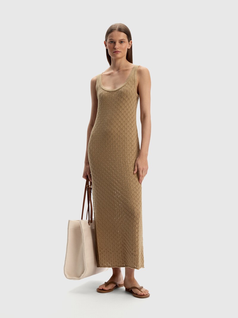 Платье макси из легкого хлопка с ажурным рисунком. Этот тонкий трикотаж комфортно облегает и отлично пропускает воздух, позволяя телу дышать. На пляже платье дополнит купальник, а если накинуть льняной жакет или рубашку — получится летний образ для города. Для этого изделия мы выбрали трикотаж с ажурным переплетением. Из-за своей воздушности, трикотаж может вытягиваться, особенно во влажную погоду, но легко восстанавливает свои размеры после стирки и утюжки.