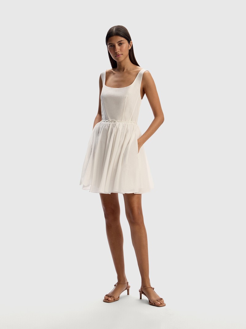 Платье мини из летящей ткани — для женственных летних образов. Прохладный шелк сочетается в нем с легким и тонким хлопком. Глубокий вырез открывает шею и ключицы, а длинный пояс можно два раза обернуть вокруг талии. Благодаря подкладке из тонкого хлопка платье держит форму и не просвечивает. При выборе размера убедитесь, что платье сидит свободно — так оно прослужит вам намного дольше. Сделано в Китае.