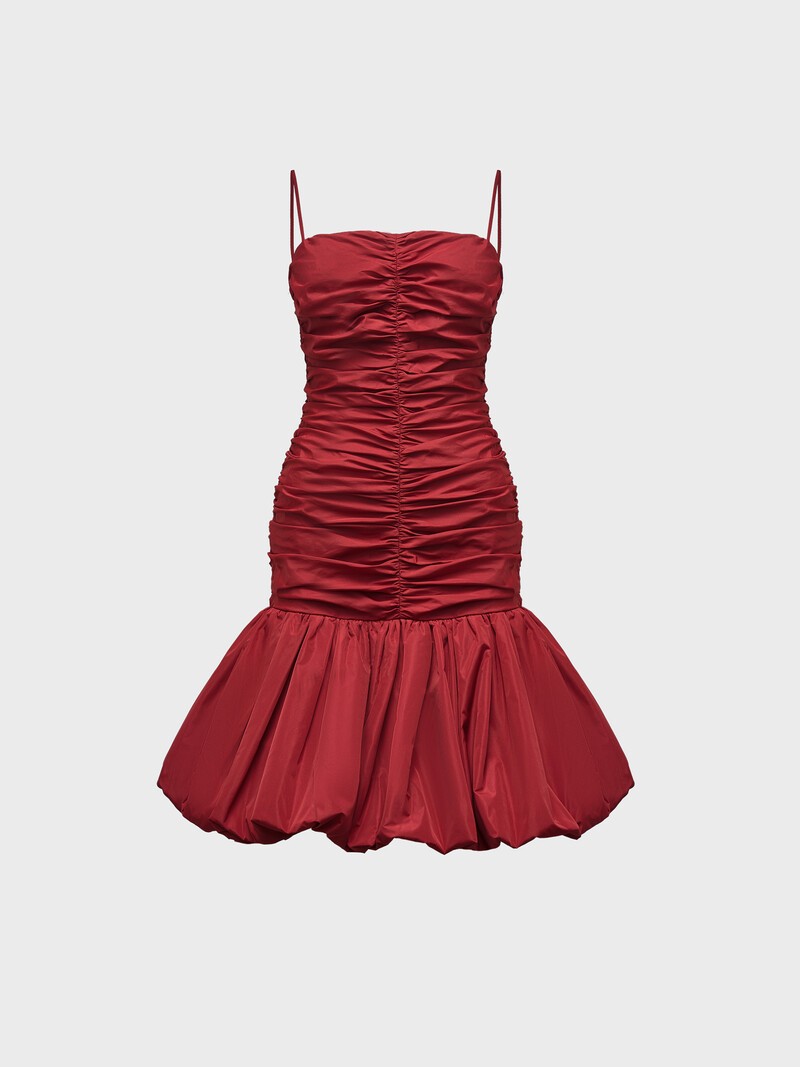 Платье из мягкой тонкой тафты, пластичной, с еле заметным блеском — для ярких, подчеркнуто женственных образов. Мелкие складки, активные линии драпировки, пышная юбка — все в нем подчеркивает силуэт и акцентирует внимание на талии и линии бедер. Это тот самый случай, когда объем не назвать избыточным. Сделано в России.