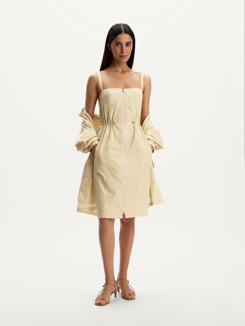 Платье из тонкой и слегка шуршащей тафты, произведенной в Италии— готовый образ для дневной прогулки или вечернего коктейля. Бретели мы сделали регулируемыми, а с помощью металлических стоперов на кулиске легко изменить силуэт. Сделано в России.