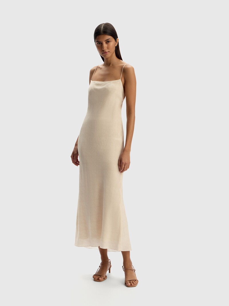 Лаконичное платье-комбинация длины миди мягко подчеркивает силуэт — и подойдет ко всему. Его можно носить и в городе, и в дни отпуска, дополнять кардиганом или жакетом — образ получится нежным и женственным. Легкий и дышащий шелковый шифон с изящным принтом мы продублировали подкладкой из вискозы и шелка. Деликатный материал требует бережного обращения. Аксессуары могут оставить затяжки или повредить нить. 100% Mulberry шелк — самый ценный вид шелковых волокон. Такой шелк сияет и переливается при любом освещении, а его нити тоньше, легче и прочнее аналогов.