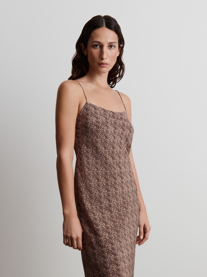Лаконичное платье-комбинация длины миди мягко подчеркивает силуэт — и подойдет ко всему. Его можно носить и в городе, и в дни отпуска, дополнять кардиганом или жакетом — образ получится нежным и женственным. Легкий и дышащий шелковый шифон с изящным принтом мы продублировали подкладкой из вискозы и шелка. Деликатный материал требует бережного обращения. Аксессуары могут оставить затяжки или повредить нить. 100% Mulberry шелк — самый ценный вид шелковых волокон. Такой шелк сияет и переливается при любом освещении, а его нити тоньше, легче и прочнее аналогов.