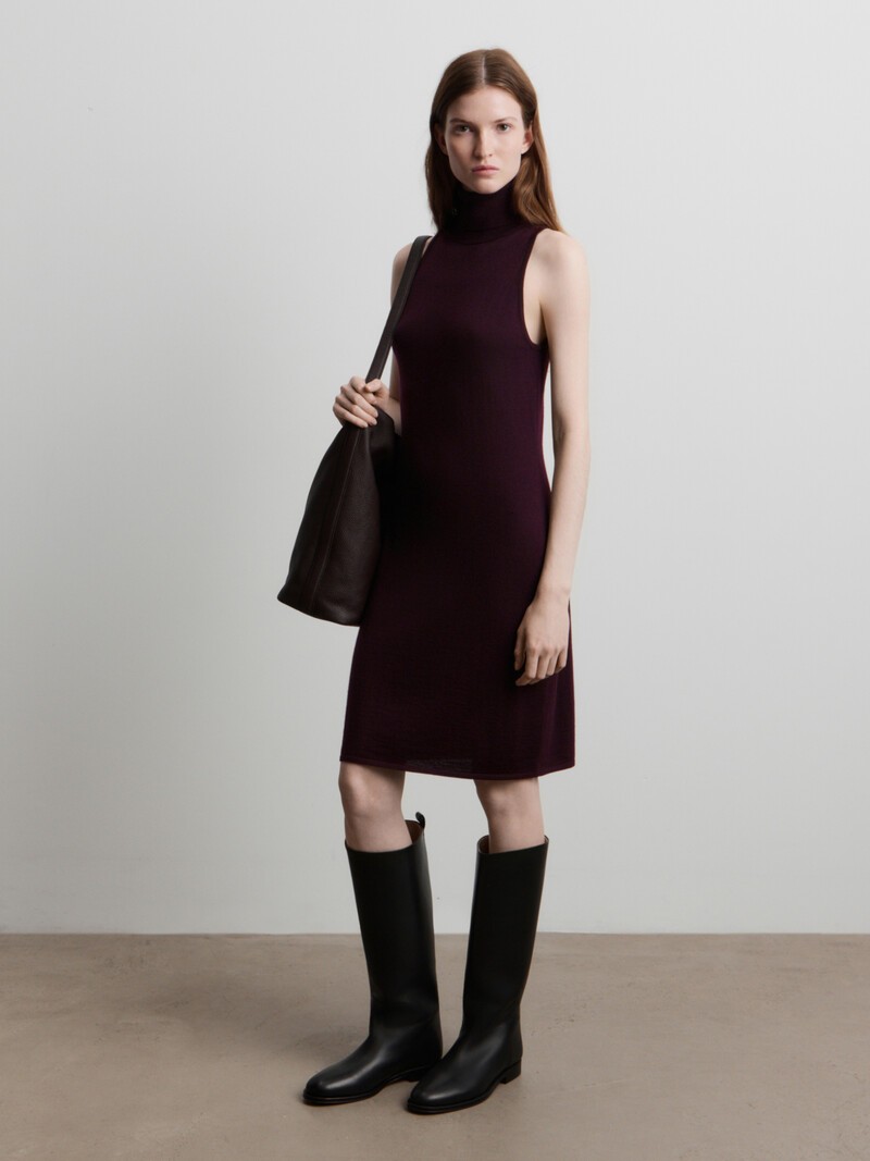Платье с высоким воротником и открытыми плечами — для тех вечеров, когда хочется выглядеть хрупко и женственно. Связано гладью из легкой и мягкой пряжи — мериноса и шелка. Трикотаж получился струящимся, с деликатным матовым блеском и достаточно тонким, поэтому рекомендуем выбрать бесшовное белье. У этого изделия низкая пиллингуемость. При правильном уходе первые пилли могут появиться на нем в среднем через 10 носок. Сделано в Китае.