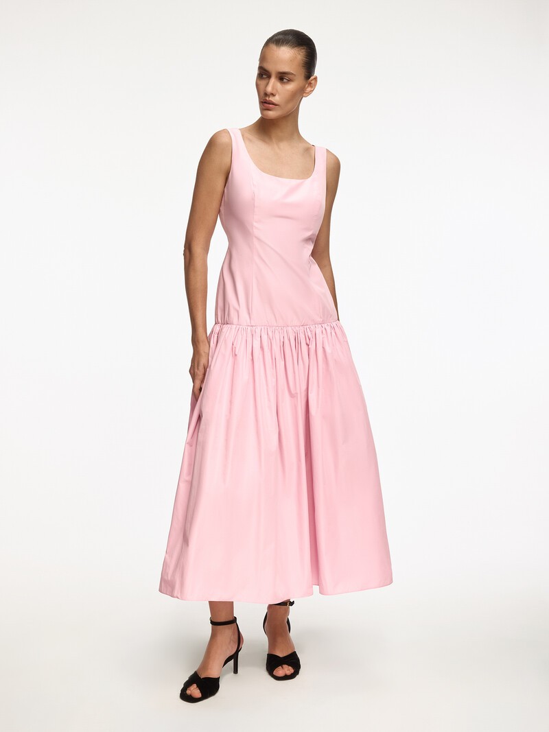 Платье из тонкой и мягкой тафты нежно-лилового цвета. Плотно облегает силуэт и подчеркивает красоту шеи благодаря глубокому вырезу каре, а заниженная линия талии и расходящаяся книзу юбка создают хрупкий образ в стиле балеткор. Фактурный пластичный материал с мерцающим блеском приятен на ощупь и мягко шуршит в движении. Застегивается на потайную молнию. Напоминаем, что тафта склонна к сминанию. Складки подчеркивают деликатный блеск, но если вы хотите сделать материал гладким, прогладьте его утюгом по инструкции на вшивном ярлыке.