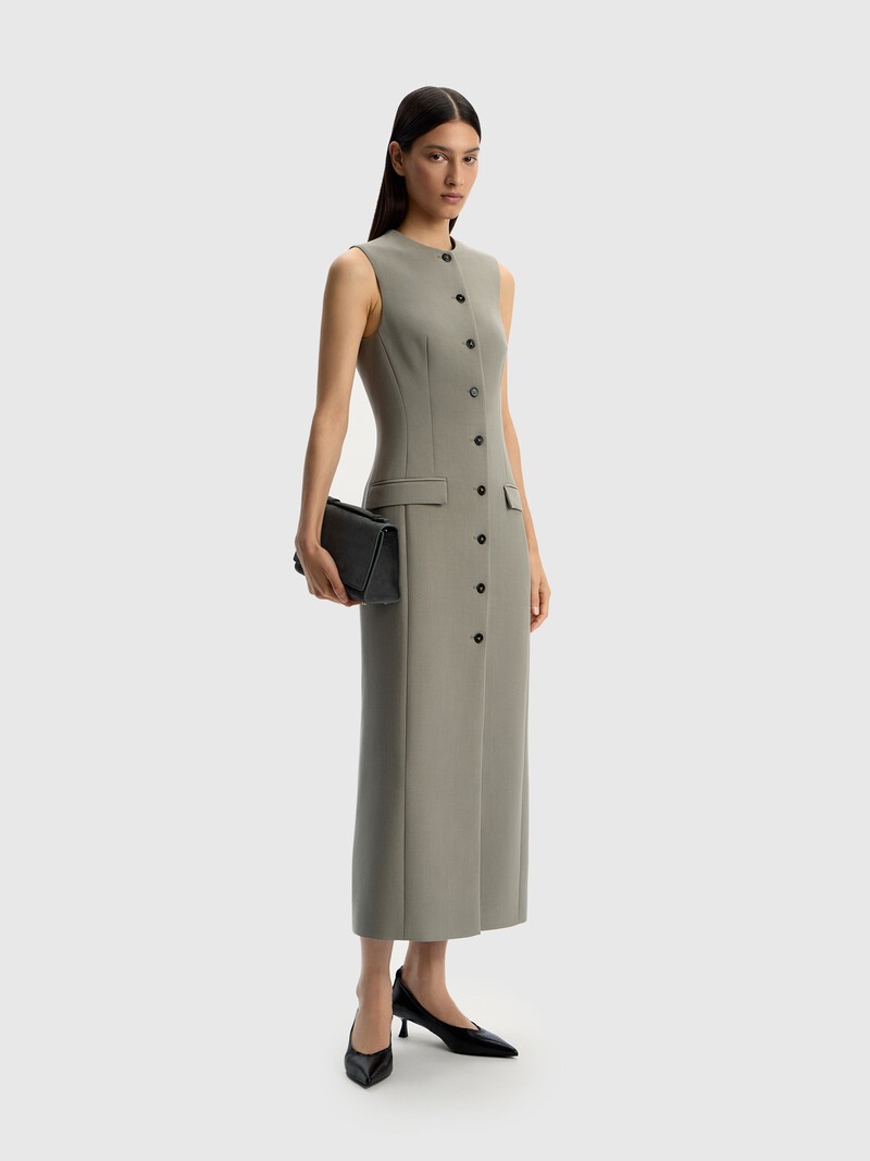 Удлиненное платье без рукавов — аккуратное, с удобными карманами и высокой шлицей сзади. Такое можно надеть под жакет или носить самостоятельно, регулируя глубину выреза в зависимости от образа. Выполнено из приятной на ощупь ткани из шерсти и искусственных волокон, которая хорошо держит форму и практична в уходе. Застегивается на роговые пуговицы. На подкладке из легкой поливискозы.