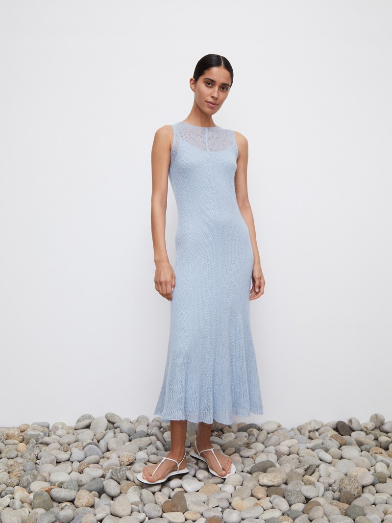 Полупрозрачное платье из тонкого мохера. Вязаное платье в пол из невесомой пушистой нити, дополненное нижним платьем из шелковистой вискозы. Деликатный материал требует бережного обращения: украшения и сумки могут зацепить или порвать тонкую нить. Сделано в Китае.