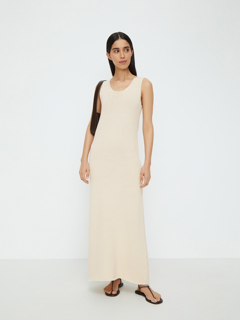 Минималистичное платье макси для летних образов стиле casual с сандалиями и объемными шоперами. Связано из неплотной дышащей пряжи на основе хлопка: материал комфортно облегает силуэт, но может вытягиваться под своим весом — храните платье на полке и не отпаривайте в вертикальном положении. Сделано в Китае.