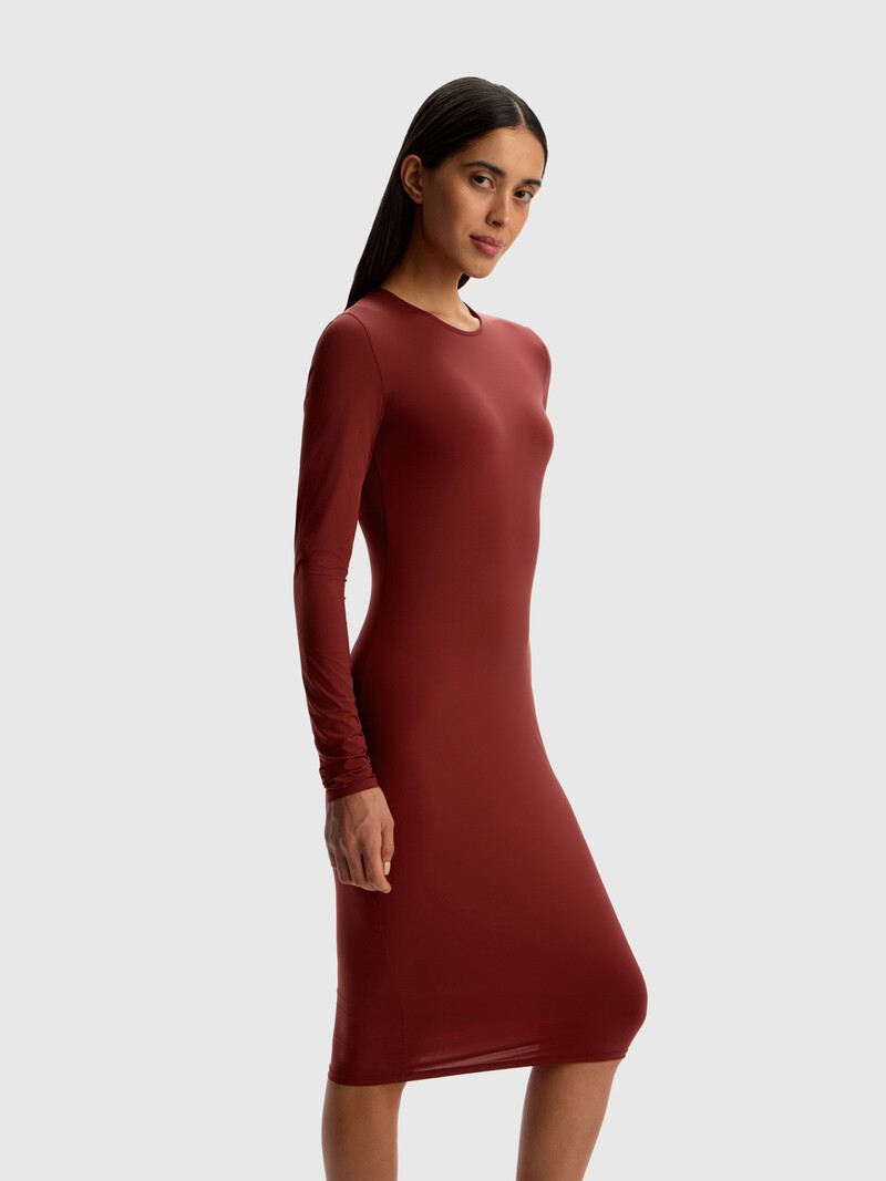 Универсальное лаконичное платье прилегающего силуэта. Аккуратный круглый вырез, комфортная длина миди — такое можно стилизовать с жакетом или носить с вечерними аксессуарами. Для этой модели мы выбрали тонкую, эластичную и гладкую ткань, которая создает ощущение второй кожи, а значит, платье будет комфортно в движении. Рекомендуем выбирать бесшовное белье.