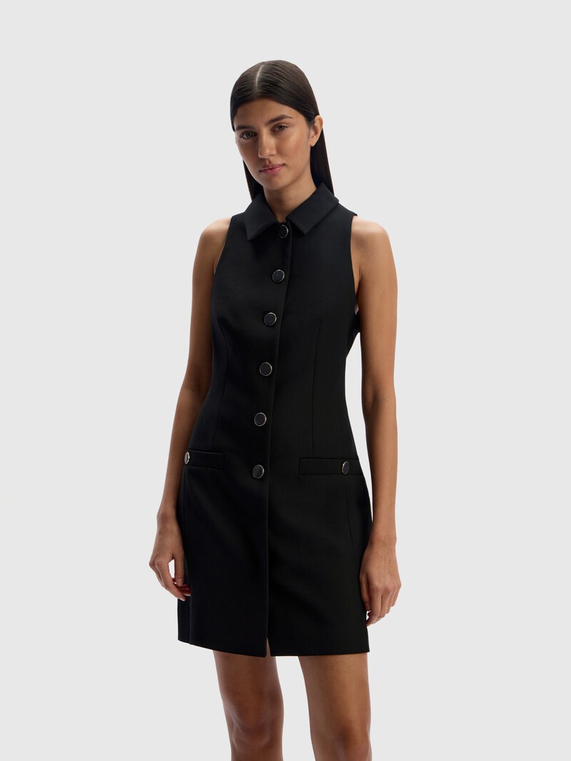 Открытое платье-футляр, по фактуре и крою напоминающее жакет, с рельефами, американской проймой и акцентными пуговицами с перламутровыми вставками. Такое можно надеть не только в жаркие дни, но и осенью. Выполнено из запатентованной ткани Ceramica от нашего португальского поставщика — приятная к коже, она отлично дышит и совсем не мнется. На тонкой подкладке.