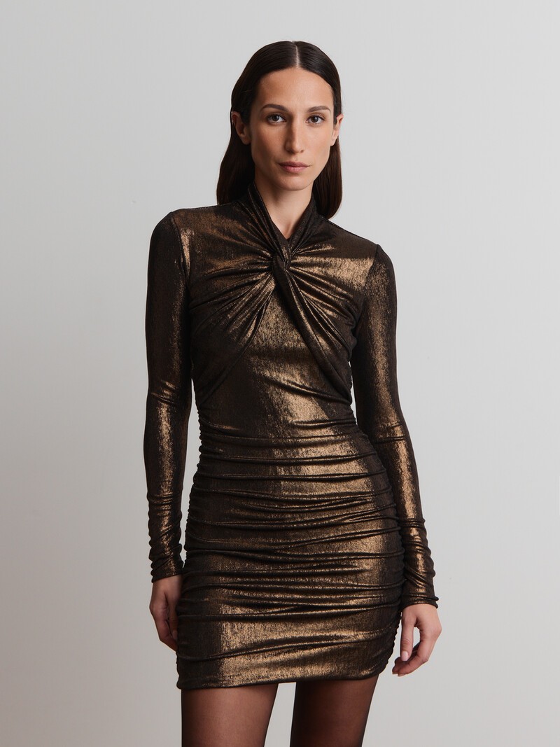 Коктейльное платье из блестящей ткани, которое вы легко стилизуете и для семейного праздника, и для более формальных мероприятий. Мы выбрали для модели плотный эластичный трикотаж — мягкий к коже, дышащий и упругий. А чтобы сделать вас центром внимания на любой вечеринке, с внешней стороны материалу придали металлизированный блеск. Рекомендуем носить на бесшовное белье. Сделано в Китае.