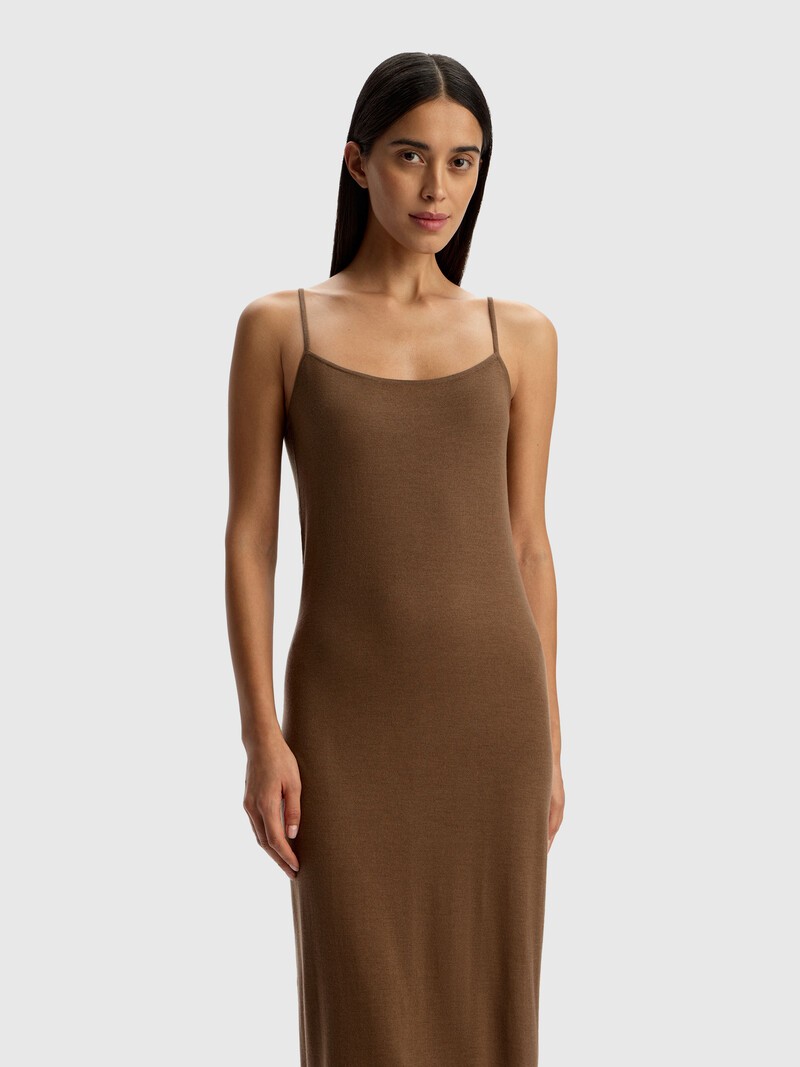 Изящное платье на тонких бретелях связано из легкой мериносовой шерсти и шелка, который придает трикотажу деликатный блеск. Лаконичный силуэт легко вписать в гардероб — например, сочетать с длинным кардиганом из нашей коллекции. Длина бретелей не регулируется, но мы дополнительно защитили их от растягивания. У этого изделия низкая пиллингуемость. При правильном уходе первые пилли могут появиться на нем в среднем через 10 носок. Сделано в Китае.