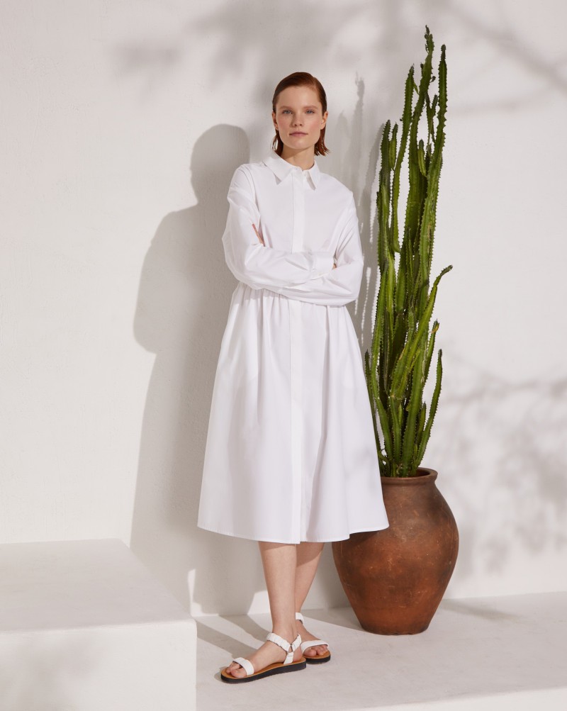 Платье-рубашка из органического хлопка. Сборка на талии и юбка А-силуэта создают пропорциональный женственный силуэт. • Застежка на пуговицы • Международный стандарт OCS (Organic Content Standard) подтверждает, что хлопок выращен бережным способом, без пестицидов, чтобы сохранить чистоту почвы и воды и исключить вредное влияние на здоровье фермеров • Легкая ткань, отлично пропускает воздух и впитывает влагу, сохраняет тепло и подходит для жарких дней Сделано в России.