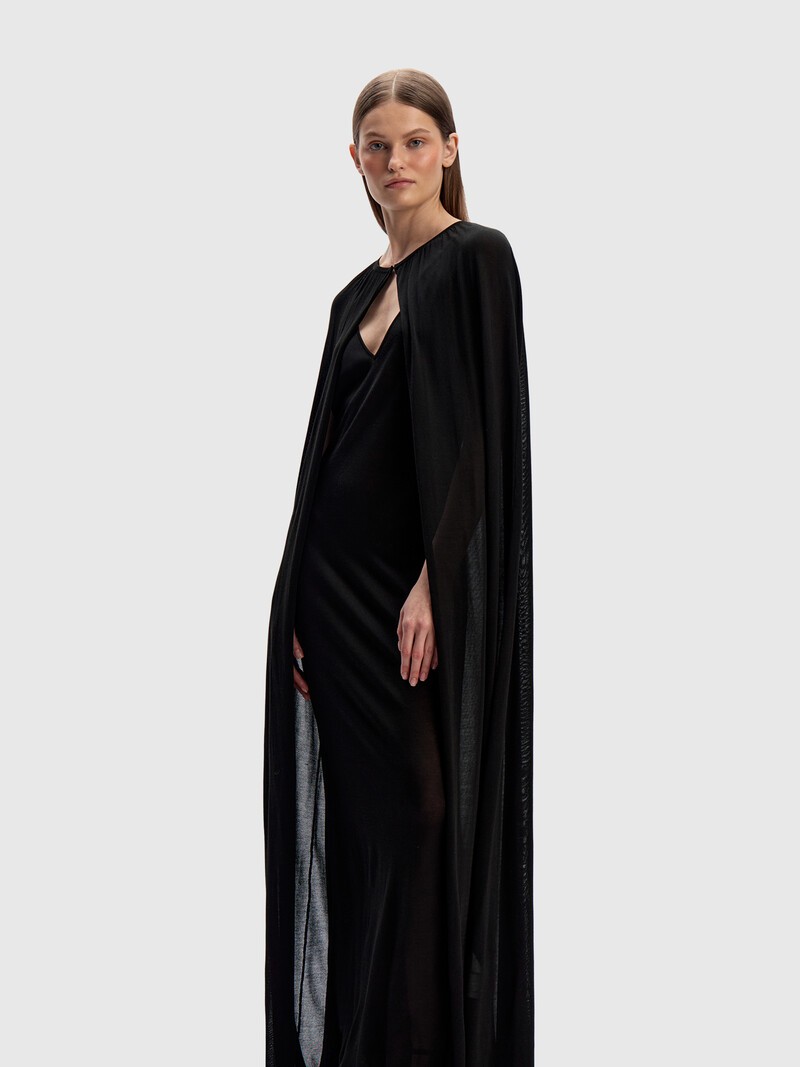 Платье макси с изящными бретелями и открытой спиной, которое дополняет легкий струящийся кейп. В нем движения становятся плавными, а силуэт — подчеркнуто женственным. Тонкий и гладкий трикотаж слегка просвечивает, поэтому мы рекомендуем подбирать белье в тон. Сделано в Китае.