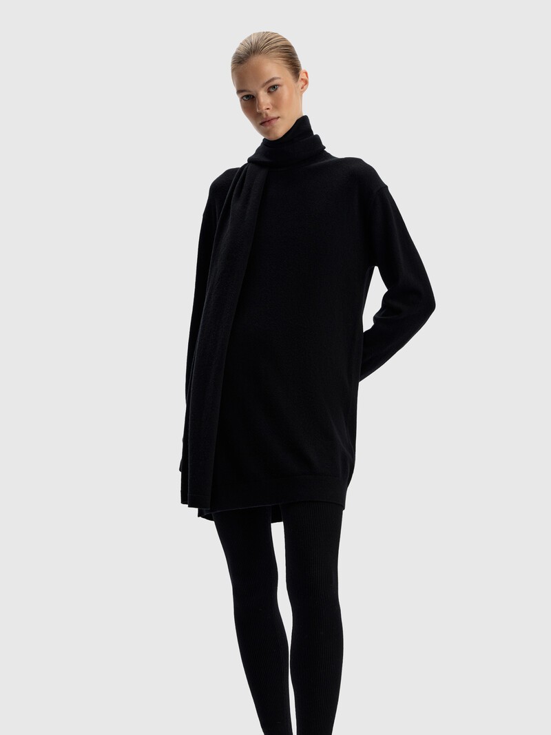 Минималистичное платье оверсайз — короткое, напоминающее мужской джемпер. Такое будет отлично смотреться с высокими сапогами-трубами, джинсами и кроссовками. В качестве аксессуара мы добавили съемный шарф, который крепится на потайную пуговицу. Связано из мягкой мериносовой шерсти с добавлением нежных волокон кашемира. Плотный и одновременно тонкий трикотаж комфортно облегает силуэт и не просвечивает. При трении о шероховатые поверхности пушистая нить может скатываться. У этого изделия средняя пиллингуемость. При правильном уходе первые пилли могут появиться на нем спустя 4-7 носок. Для удаления пиллей пользуйтесь специальной машинкой.