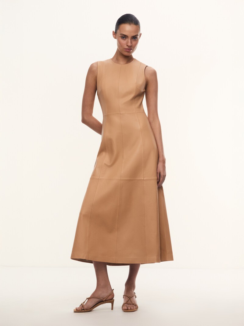 1. Для этой модели мы выбрали мягкую и пластичную кожу ягненка полурастительного дубления — она годами сохраняет природную прочность 2. Формирует силуэт за счет акцента на талии и объемной юбке макси 3. Внутри — подкладка стрейч, благодаря которой платье комфортно садится и дольше служит 4. Поставщик, с которым мы сотрудничаем, имеет наивысшую оценку организации по защите окружающей среды LWG — золотой сертификат. Это значит, что фабрика полностью соответствует требованиям экологической безопасности, имеет все необходимые очистные сооружения и заботится о здоровье сотрудников