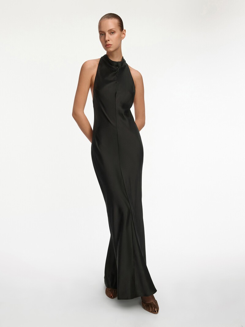 1. Сшито из 100% шелка Mulberry плотностью 22 mm. Его тонкие и прочные нити сияют и переливаются при любом освещении 2. Лиф с драпировкой и глубокие американские проймы подчеркивают красоту шеи и рук 3. Юбка с клиньями мягко расходится книзу — в платье легко двигаться и танцевать 4. Легко стилизовать — платье самодостаточно, но если понадобится, его можно дополнить жакетом