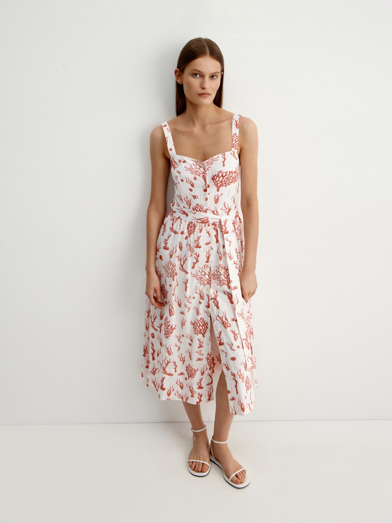 Нежный сарафан из тончайшего молочного хлопка с кораллами оттенит загар и подчеркнет талию благодаря узкому поясу и пышной юбке. Сарафан сшит из двух слоев ткани, поэтому держит форму, не просвечивает и будет уместен как в городе, так и на пляже. Сделано в России