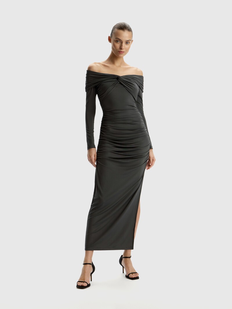 Мягкое длинное платье для женственных образов: изящная линия плеч, прилегающий силуэт, узкие рукава, высокий разрез и эффектная драпировка. Мы создали его из легкого, тонкого матового трикотажа на основе вискозы — такой материал прекрасно дышит и струится в движении. Сделано в России.