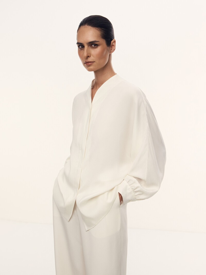 1. 100% шелк Mulberry плотностью 30 момми. С помощью особой обработки эту ткань сделали мягче обычного шелка, она не блестит и не скользит по коже 2. Лаконичный дизайн без карманов, с пышными рукавами подходит как для особых случаев, так и для повседневных образов 3. Застежка на пуговицы из натурального перламутра
