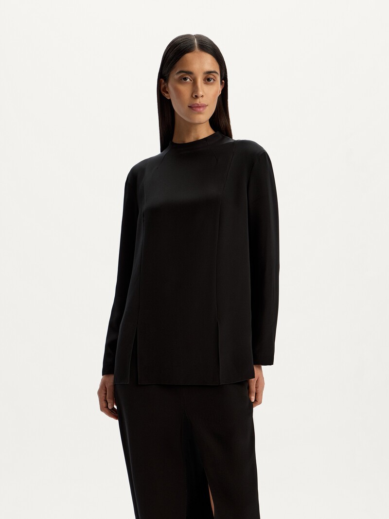 Удлиненная блузка из плотного шелка. Невысокий воротник-стойка, комфортная свободная посадка и аккуратная линия плеч. Рельефы и разрезы визуально вытягивают силуэт. Выполнена из долговечного тутового шелка высшего качества, а для внутренних обработок мы использовали шелковый шифон. Застегивается на потайную молнию. 100% Mulberry шелк — самый ценный вид шелковых волокон. Сотканный из тончайших нитей, этот матовый материал отличается особой прочностью. Сделано в России.