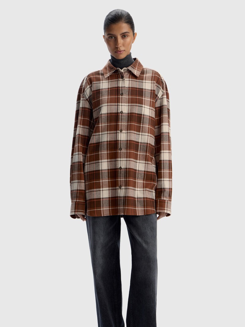 Прямая свободная рубашка из плотной, ворсистой фланели в клетку. Тактильно приятный мягкий хлопок с начесом с обеих сторон отлично дышит и создает пластичные складки, не добавляя лишний объем. Мы тщательно подошли к совмещению линий, чтобы рубашка выглядела аккуратно — носите ее как верхний слой с футболкой или кроп-топом или застегивайте на все пуговицы. Ворсистая ткань со временем может скатываться — справиться с пиллями поможет стирка. Сделано в Китае.
