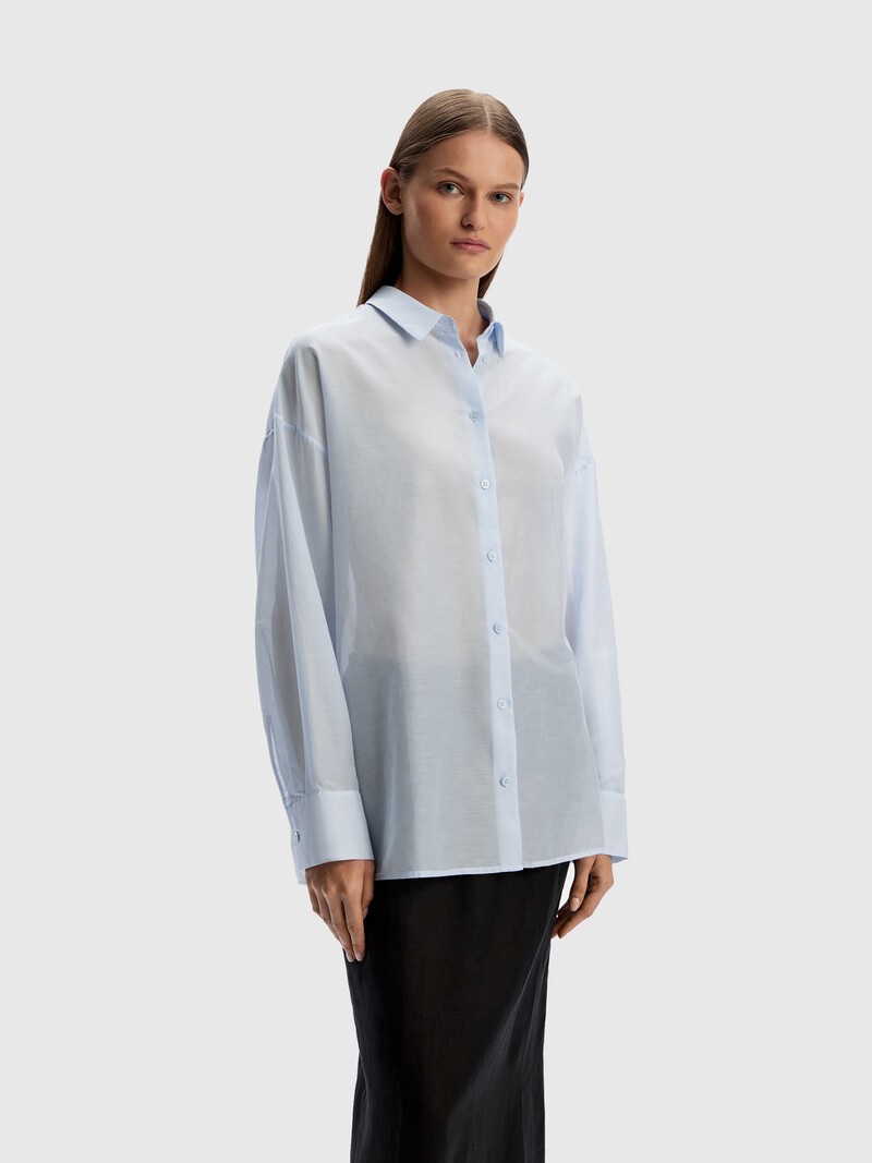 Свободная рубашка для летних дней. Мы выбрали для нее тонкую полупрозрачную смесь хлопка и шелка — ткань деликатно поблескивает в складках и отлично пропускает воздух. Застегивается на пуговицы из речного перламутра. При выборе размера рекомендуем убедиться, что рубашка сидит свободно, без натяжения в швах — так она прослужит вам намного дольше. Сделано в Китае.