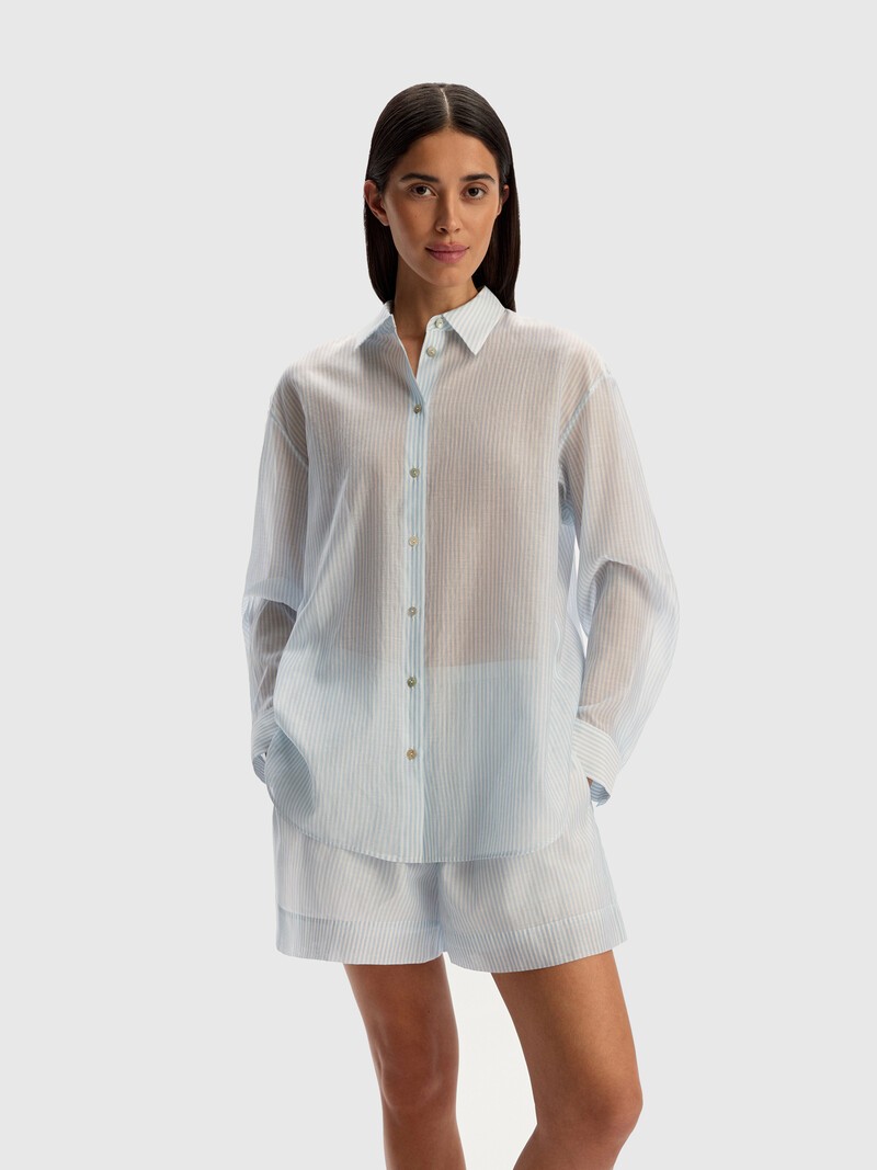 Рубашка из легкого хлопка с шелком в тонкую полоску — вряд ли найдется более летнее сочетание, чем белый и голубой. Застегивается на перламутровые пуговицы и оставляет ощущение прохлады благодаря свободному силуэту. При выборе размера рекомендуем убедиться, что рубашка сидит свободно, без натяжения в швах.