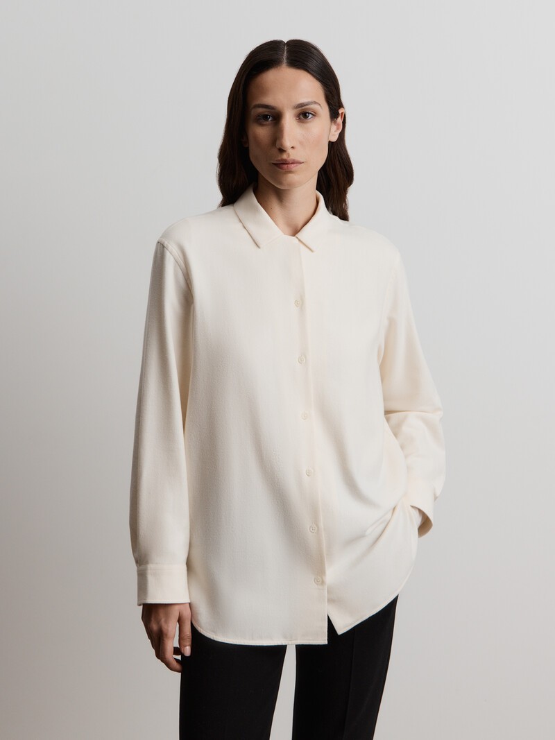 Рубашка из теплого бархатистого хлопка в елочку, созданного итальянской фабрикой, которая сотрудничает с Dior, Hermes и Prada. Мягкость ткани заметна даже визуально: плавные линии манжет и воротника создают более расслабленный образ, чем классические сорочки, а светлые оттенки легко вписываются и освежают гардероб. Ворсистая ткань со временем может скатываться — справиться с пиллями поможет стирка. Сделано в Китае.