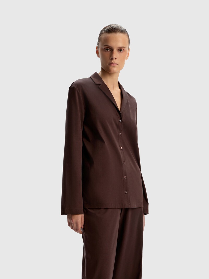 Лаконичная рубашка из трикотажа — прямая, свободная, с женственным V-вырезом и чуть спущенным плечом. Мягкий отложной воротник и застежка на пуговицы в тон сделают образ особенно уютным. Выполнена из тонкого плотного хлопка супима, который отличается прочностью и долговечностью. Сочетайте с брюками из нашей коллекции. Мерсеризованный хлопок — мягкий и гладкий, с шелковистым блеском. Специальная обработка волокон делает материал более прочным и защищает от выцветания. Сделано в Китае.
