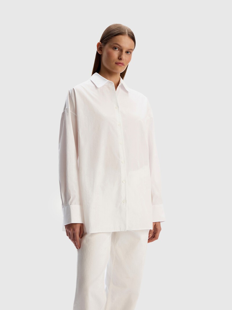 Универсальная белая рубашка — свободный силуэт, застежка на перламутровые пуговицы, широкие манжеты и спущенное плечо. Такую можно надеть под пиджак в межсезонье или носить в жаркое время года. Португальская ткань — плотный дышащий хлопок, который хорошо держит форму, не просвечивает и еле заметно мерцает в складках.