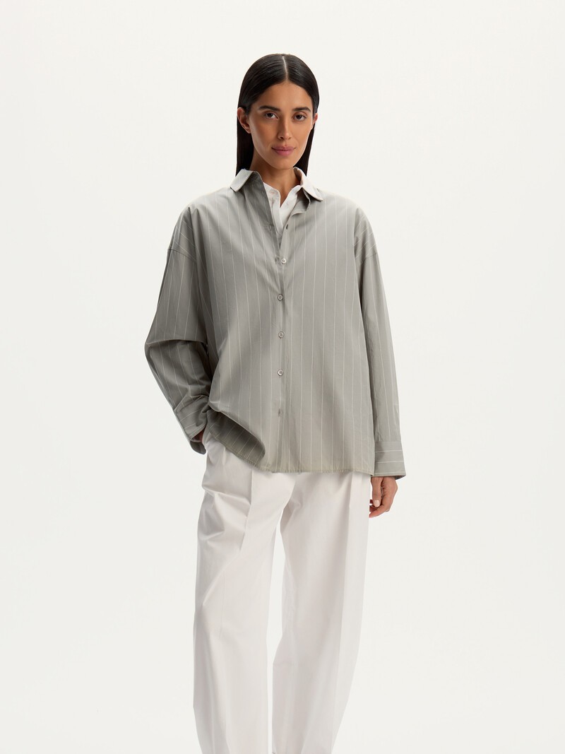 Универсальная и уютная рубашка в полоску: спущенное плечо, широкие манжеты на пуговицах, складка на спине для объема. Мы сшили ее из мягкого дышащего хлопка от нашего португальского поставщика. Такой материал отличается плотностью, не просвечивает и деликатно мерцает в складках — а значит, рубашку можно носить круглый год. Сделано в Турции.