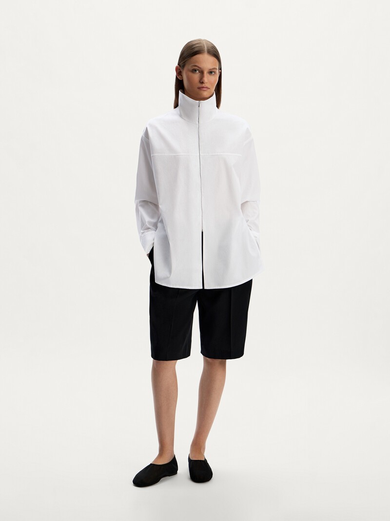Альтернатива привычным хлопковым рубашкам — свободная модель с молнией и разрезами. Ее можно стилизовать по-разному: носить нараспашку как легкий верхний слой, красиво разложить воротник по плечам или наглухо застегнуть. Выполнена из мягкого дышащего хлопка от нашего португальского поставщика. Легкий материал слегка поблескивает в складках, хорошо держит форму и не просвечивает, если надеть под низ белье в тон. Застегивается на молнию. Сделано в Китае.