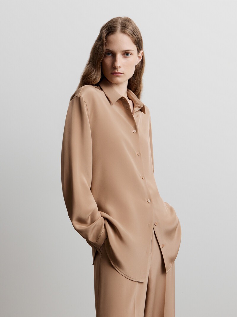 Рубашка из плотного матового шелка — достаточно свободная и аккуратная. Изящный узкий воротник и манжеты подчеркивают женственность образа, а утонченный материал позволяет стилизовать рубашку и для офиса, и для вечерних мероприятий. Застегивается на пуговицы из перламутра. 100% Mulberry шелк — самый ценный вид шелковых волокон. Сотканный из тончайших нитей, этот матовый материал отличается особой прочностью. Сделано в России.