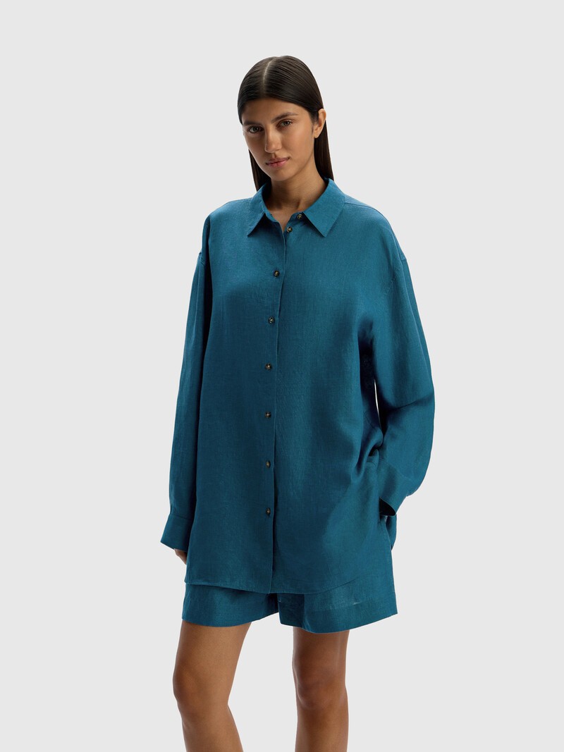 Объемная рубашка с удлиненной спинкой и скругленными разрезами по бокам, благодаря которым ее удобно носить заправленной или навыпуск. Материал — тонкий, легкий и пластичный лен, окрашенный в нитях: это сделало оттенок более глубоким и придало рубашке винтажные эффекты, как будто ее варили, как деним. European Flax — сертифицированный европейский лен высшего качества: помогает сократить глобальный углеродный след, безопасен для человека и становится лучше с каждой стиркой. Сделано в Китае.
