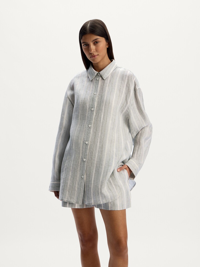 Свободная рубашка из тонкого льна в серо-бежевую полоску — пластичный и легкий, он оттеняет загорелую кожу. Асимметричный нижний край и скругленные разрезы по бокам позволят носить рубашку навыпуск или заправить внутрь. European Flax — сертифицированный европейский лен высшего качества: помогает сократить глобальный углеродный след, безопасен для человека и становится лучше с каждой стиркой. Сделано в Китае.